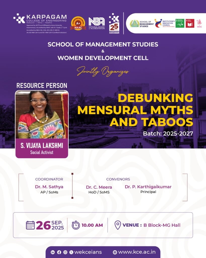 The School of Management Studies and Women Development Cell of Karpagam College of Engineering jointly organized a Women Wellness programme on 26/09/2025 (Friday).The objective of the programme was to create awareness among young women about menstrual health, break the silence surrounding menstruation, and eradicate the age-old misconceptions associated with it.