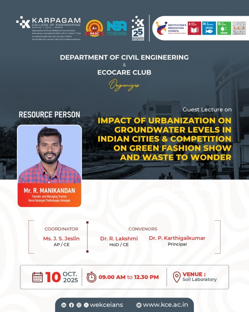 The Department of Civil Engineering organised a Guest Lecture on “Impact of Urbanization on Groundwater Levels in Indian Cities” along with a student competition titled “Green Fashion Show and Waste to Wonder” on 10th October 2025.
