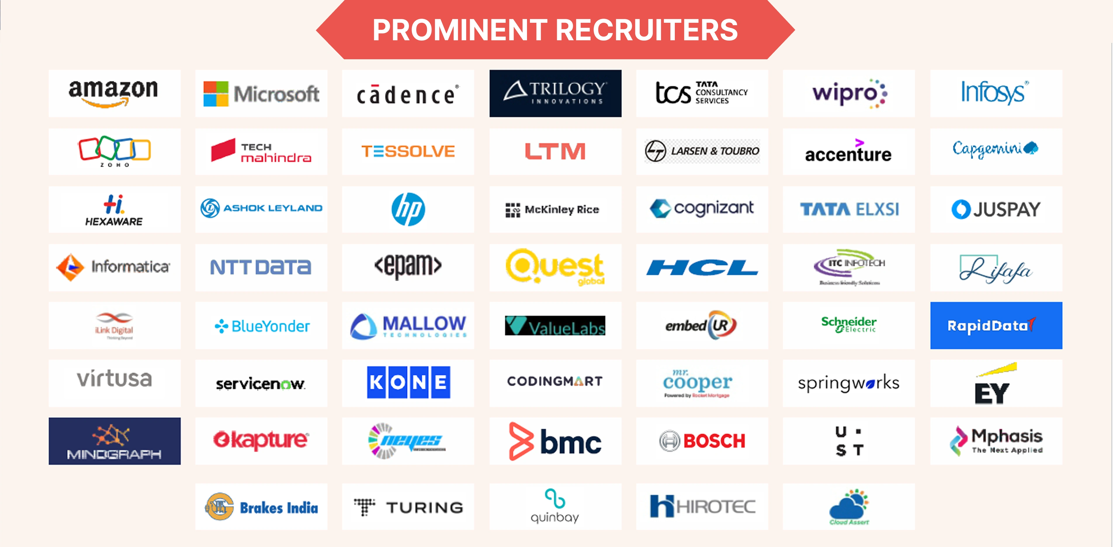 The placement cell takes immense effort in guiding the students for their successful career.The college has active MoUs & Centers of excellence with various prominent players in various industries. The college is visited by various Multinational companies year after year for placements and hence the college had a blistering placement record.