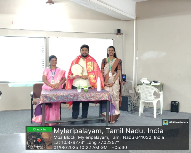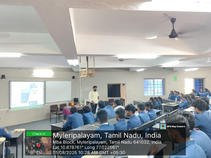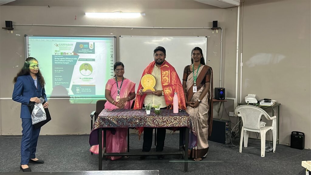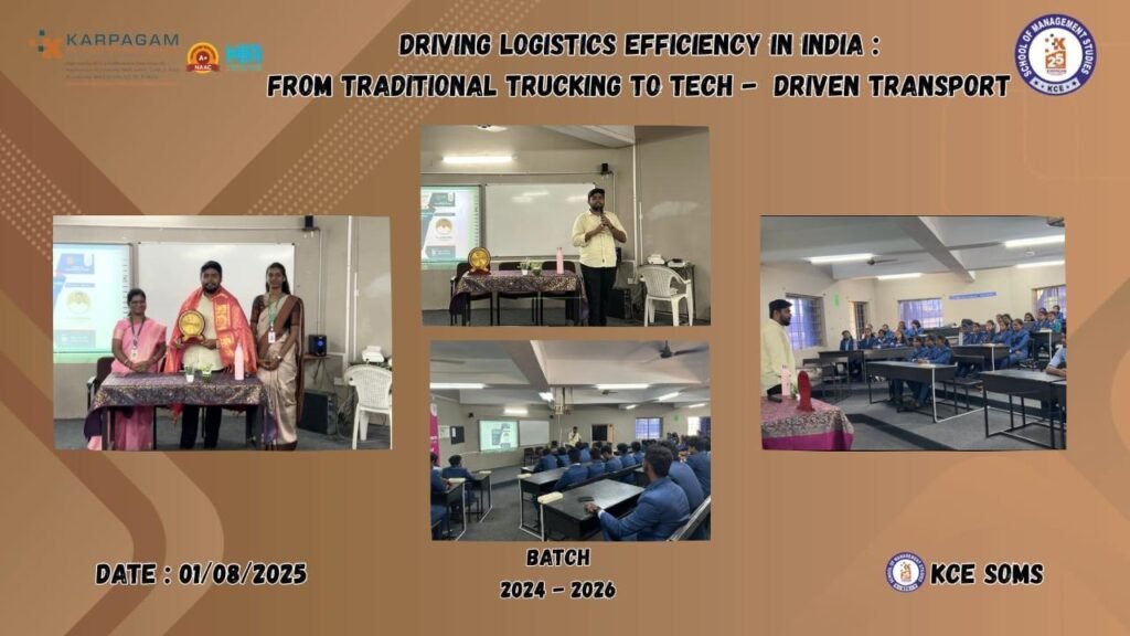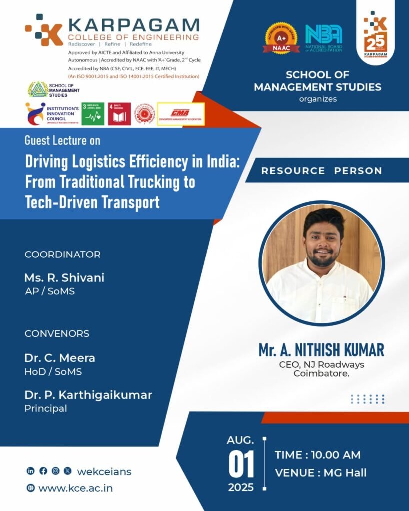 School of Management Studies at Karpagam College of Engineering organized an expert guest lecture on August 1, 2025, titled “Driving Logistics Efficiency in India: From Traditional Trucking to Tech-Driven Transport.” The session took place at MG Hall at 10:00 AM. This event was conducted under the coordination of Ms. R. Shivani, Assistant Professor of SoMS, with the support and leadership of Dr. C. Meera, Head of the Department of Management Studies, and Dr. P. Karthigaikumar, the Principal of the institution.