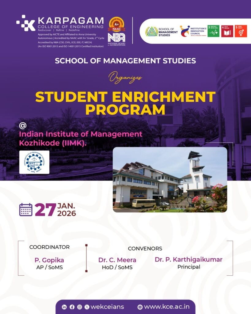 The School of Management Studies organized a Student Enrichment Program at the Indian Institute of Management Kozhikode (IIMK) with the objective of enhancing students’ academic exposure and strengthening their practical understanding of management education.