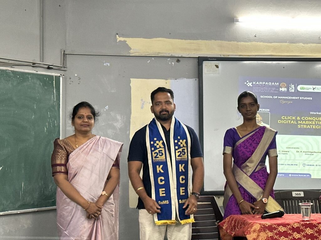 School of Management Studies at Karpagam College of Engineering organized a one-day workshop titled “Click & Conquer: Digital Marketing Strategies” on 14th November 2025 for MBA Batch 2024–2026. The session was conducted by Dr. Vibinchandar Selvaraj, Founder and Chairman of Decodet Technologies, Hyderabad.