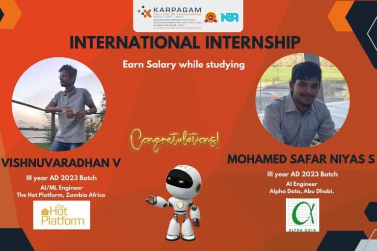 The B. Tech. in Artificial Intelligence and Data Science program at Karpagam College of Engineering is designed to prepare students for the future of technical education in AI and Machine Learning (ML). The curriculum offers a comprehensive understanding of AI and ML technologies, with courses covering specialized areas such as computer vision, natural language processing, robotics, data analytics, and computer security. Students gain deep knowledge in algorithm analysis, modern computer architecture, foundations of AI, data science, and machine learning, among other core areas.